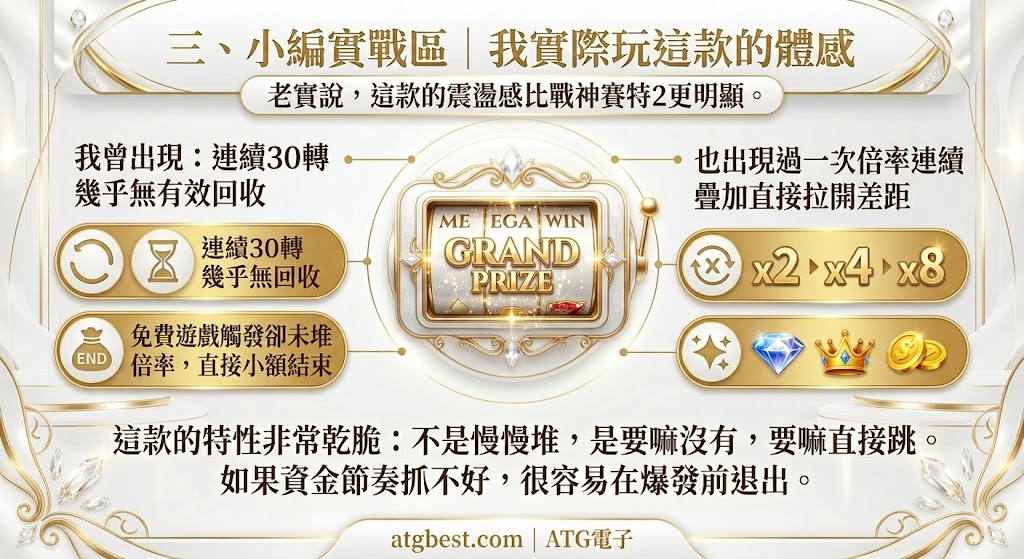 ATG電子武俠是旗下倍率天花板極高的老虎機代表作,RTP 97%、高波動設計,最高倍率可達 x100000。本文以「獎金分布右尾拉長」為核心,拆解這類極端高倍率機型為何常見空轉...